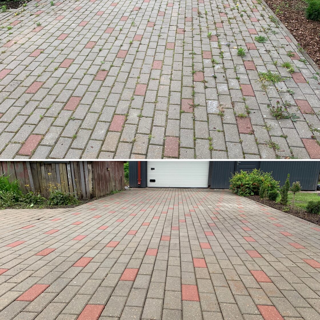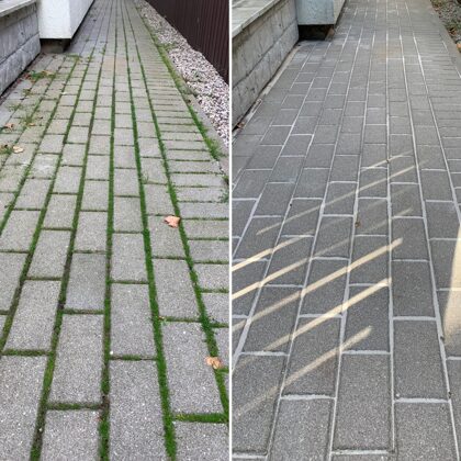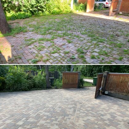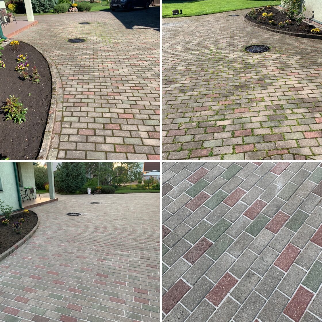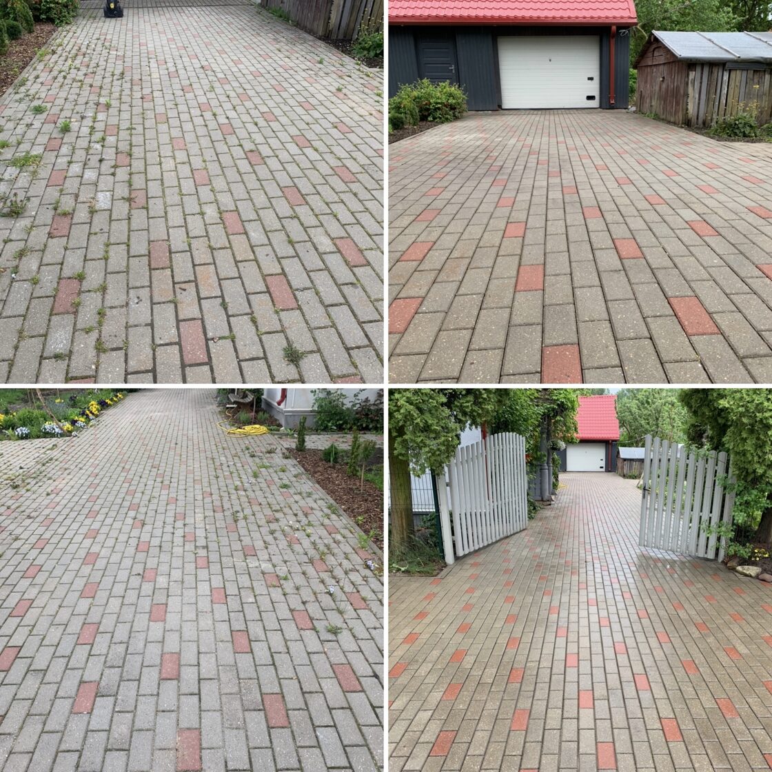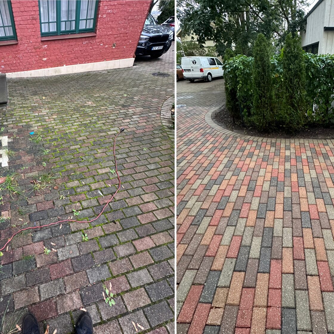 - Bruģa tīrīšanai tiek izmantota profesionāla augspiediena mazgāšanas tehnika.