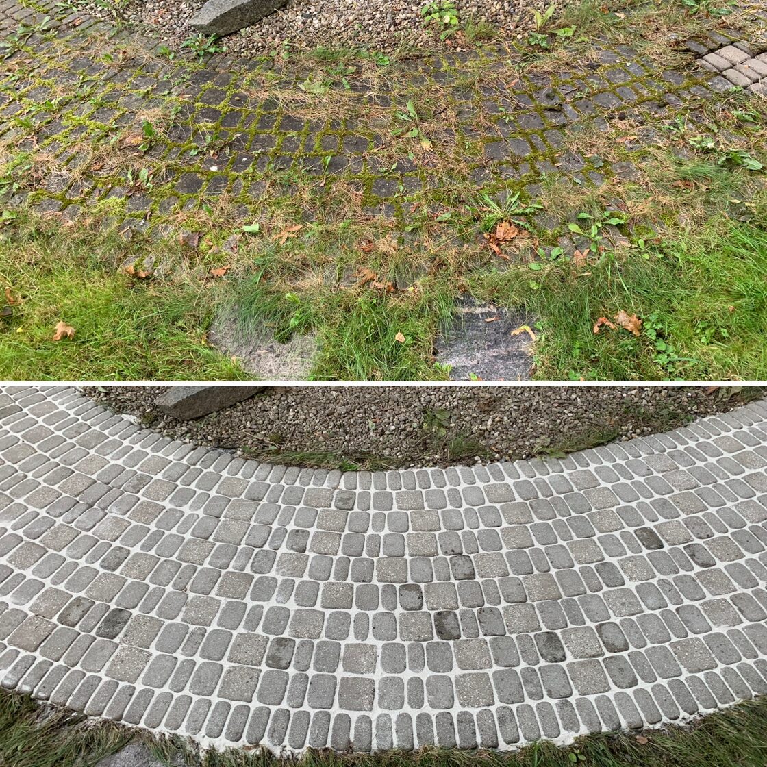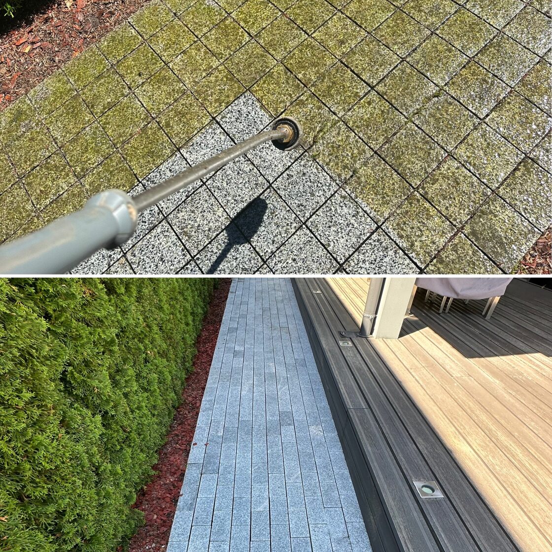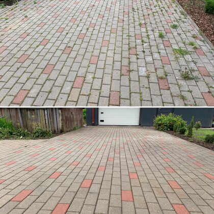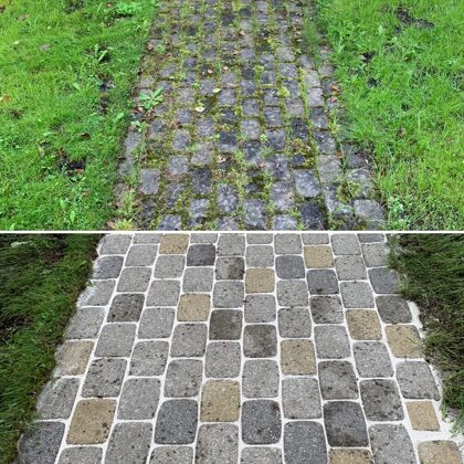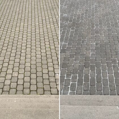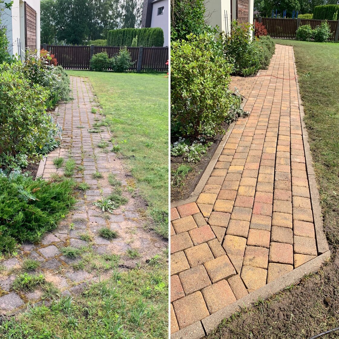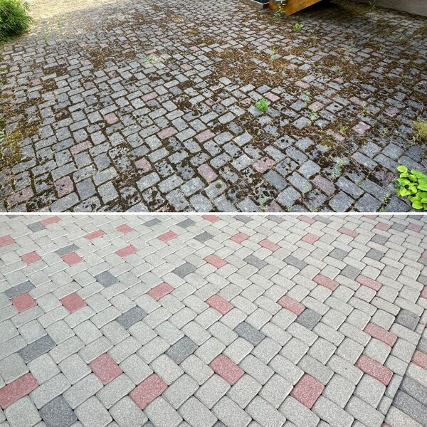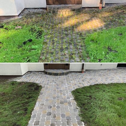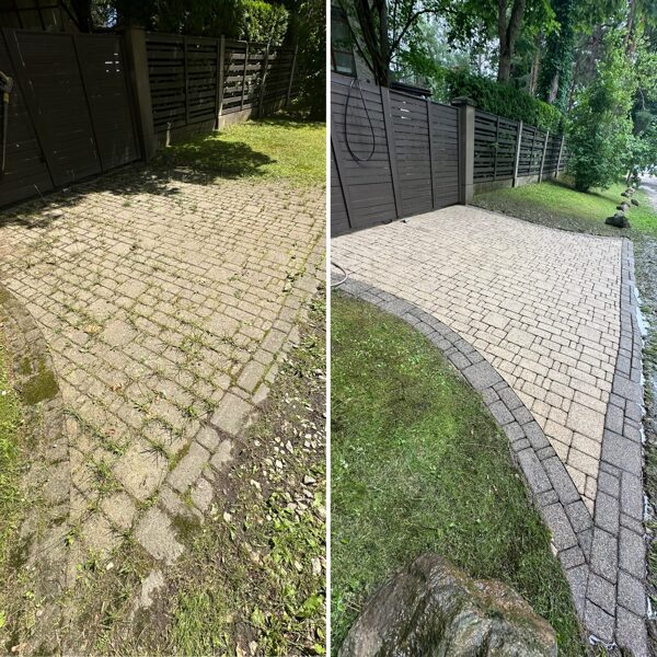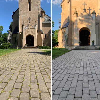 - Bruģa tīrīšanai tiek izmantota profesionāla augspiediena mazgāšanas tehnika.