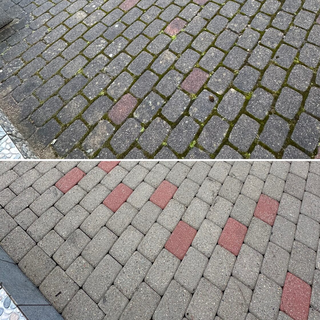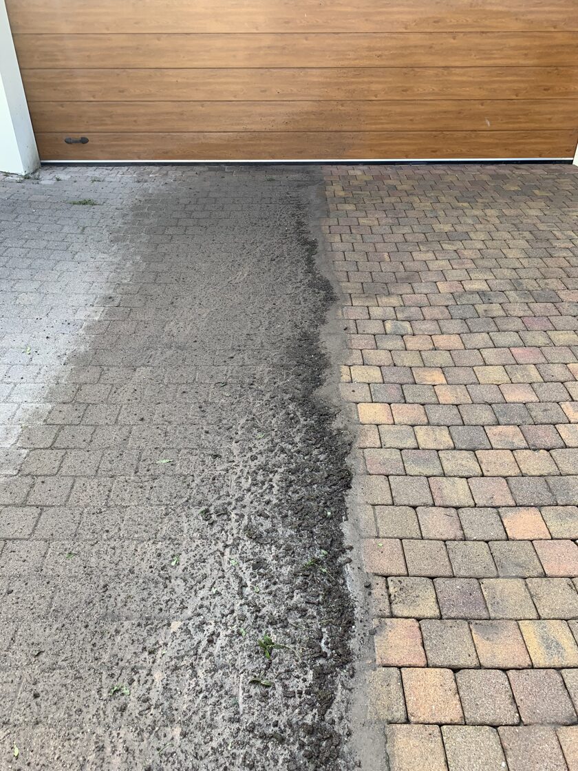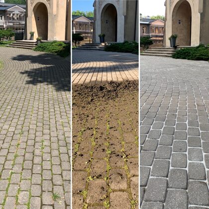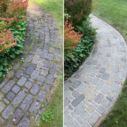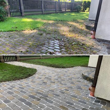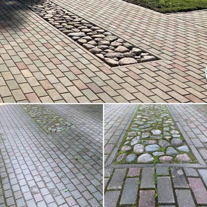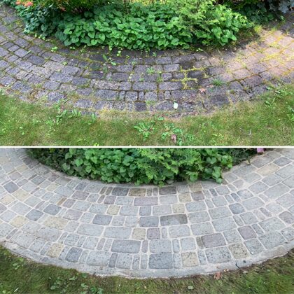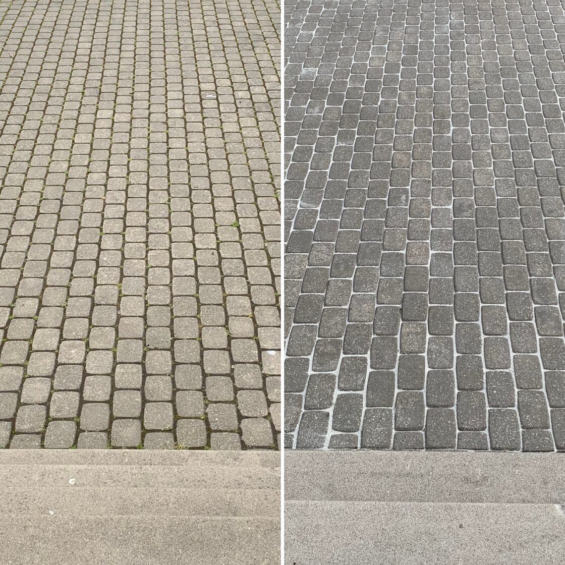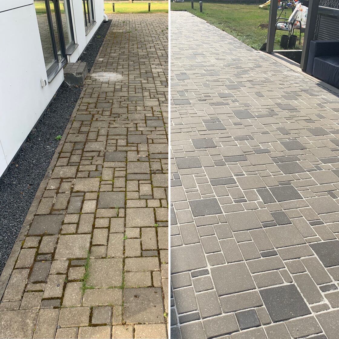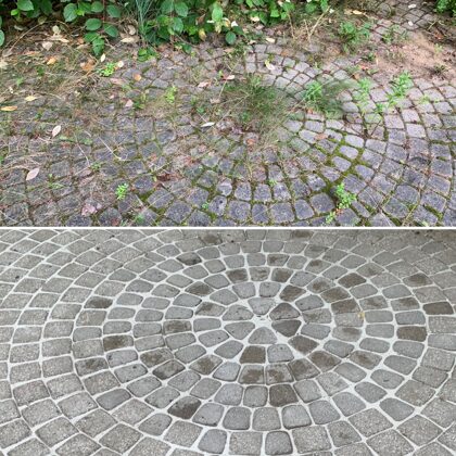 - Bruģa tīrīšanai tiek izmantota profesionāla augspiediena mazgāšanas tehnika.