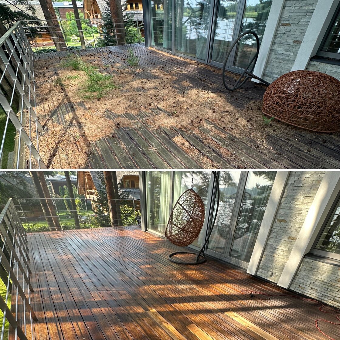 Pirms atjaunošanas terase ir jānomazgā, jo virsējā kārta ir piedzīta ar netīrumiem.